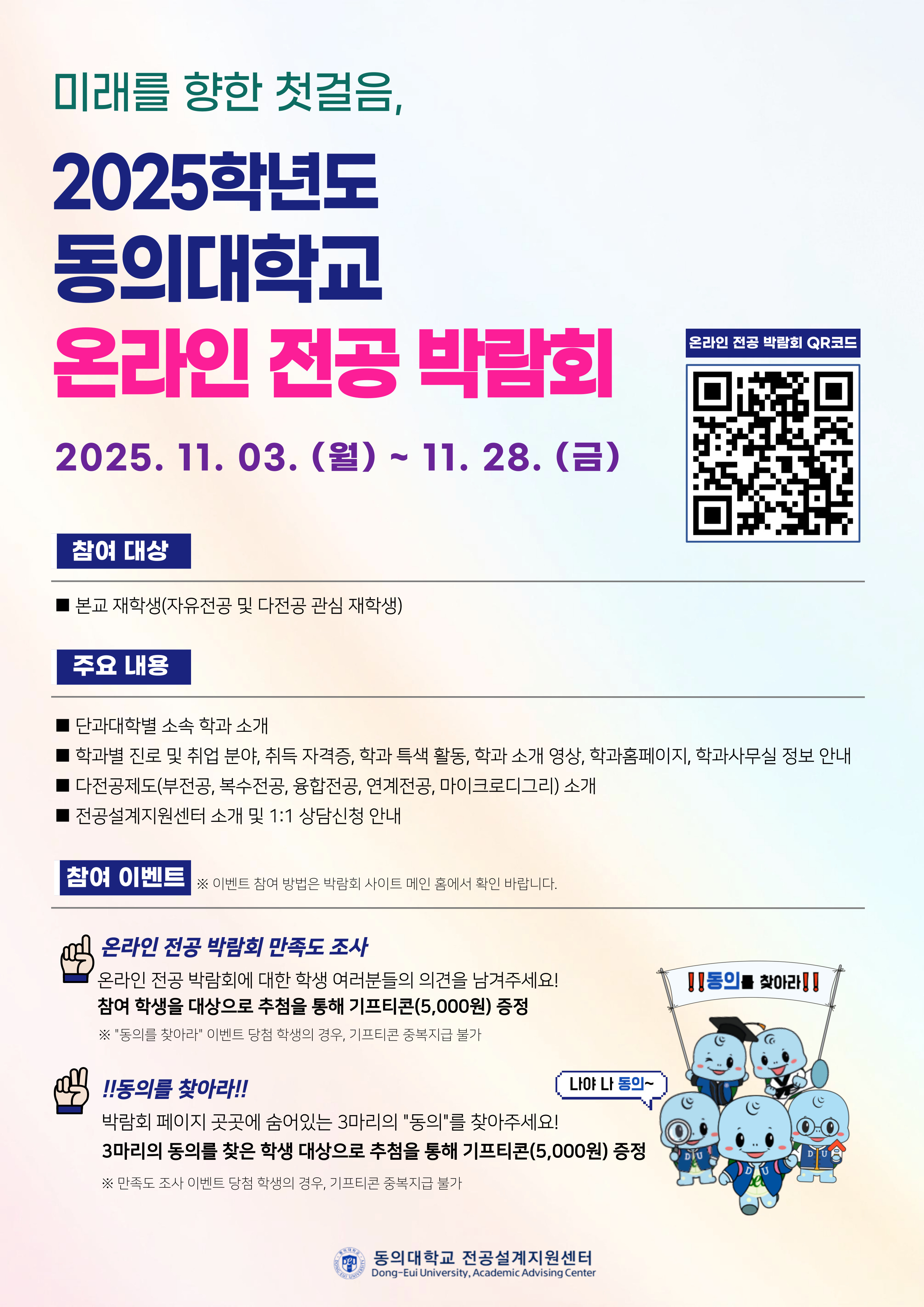 전공설계지원센터에서는 학생들의 학과(전공) 이해도를 제고하고, 합리적인 전공 선택을 지원하기 위해 2025학년도 동의대학교 온라인 전공 박람회를 다음과 같이 개최하고자 합니다. 학생들의 많은 참여가 가능하도록 적극적인 홍보 부탁드립니다.